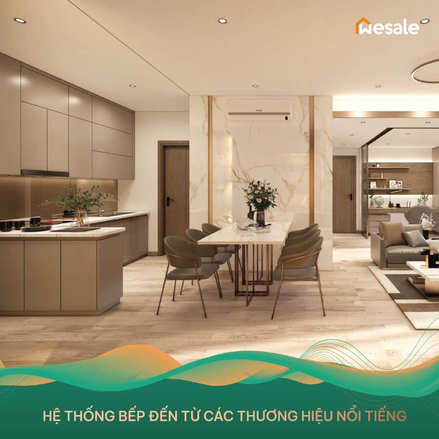 Phòng bếp hoàn thiện với hệ thống tủ bếp đến từ các thương hiệu KOK/ SAVIMEX/ CASTA, bếp điện đôi, chậu rửa, vòi rửa, máy hút mùi hiện đại…