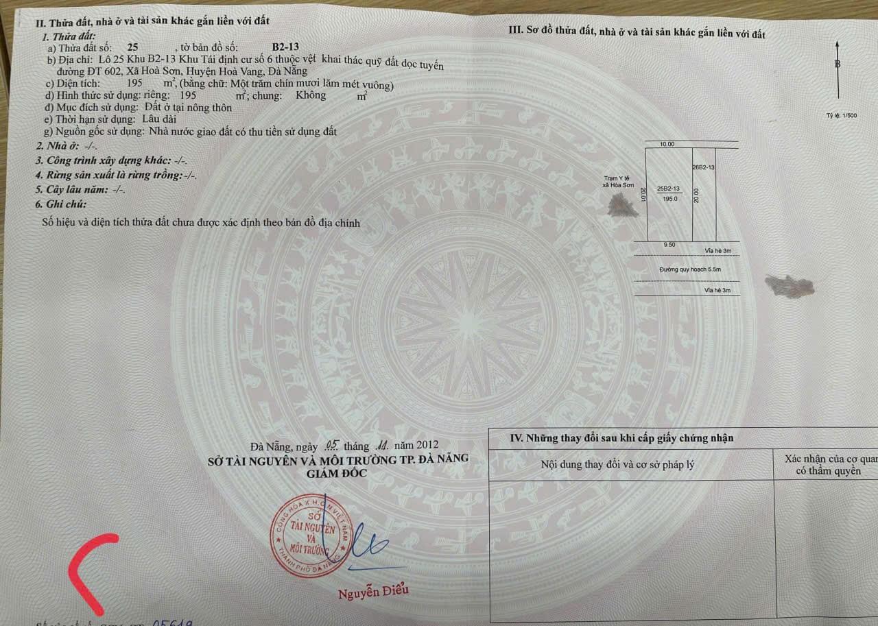 Cần bán lô đất nền 195m2 khu tái định cư hoà sơn 6, phường Hoà Khánh, Đà Nẵng